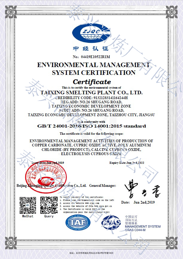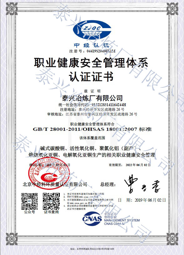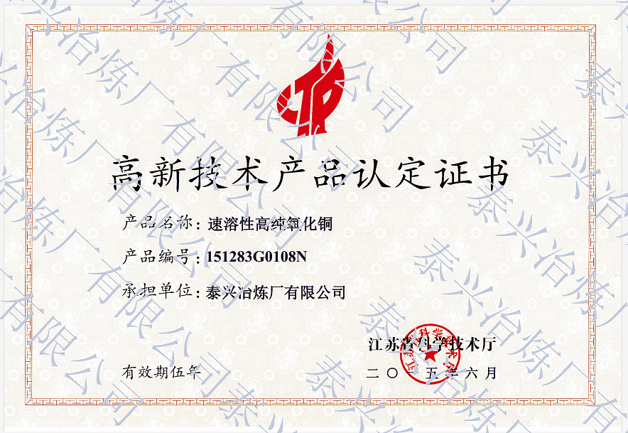 泰興冶煉廠有限公司(原泰興冶煉廠),始建于20世紀(jì)70年代初,現(xiàn)位于江蘇省泰興經(jīng)濟(jì)開發(fā)區(qū)。歷經(jīng)40年的創(chuàng)新驅(qū)動(dòng)、穩(wěn)健發(fā)展,已成長為一家專業(yè)生產(chǎn)堿式碳酸銅、高純電鍍氧化銅、氧化亞銅、氧化銅、無水硫酸銅、海綿銅粉及副產(chǎn)品聚氯化鋁(凈水劑)等系列無機(jī)鹽產(chǎn)品及處置不含氨的氯化銅蝕刻液(HW22)15000噸/年的“國家高新技術(shù)企業(yè)”和地方性骨干企業(yè)。公司總占地面積3.7萬平方米,建筑面積4萬平方米,注冊資本2088萬元,固定資產(chǎn)1.2億元,年產(chǎn)值約7億元。